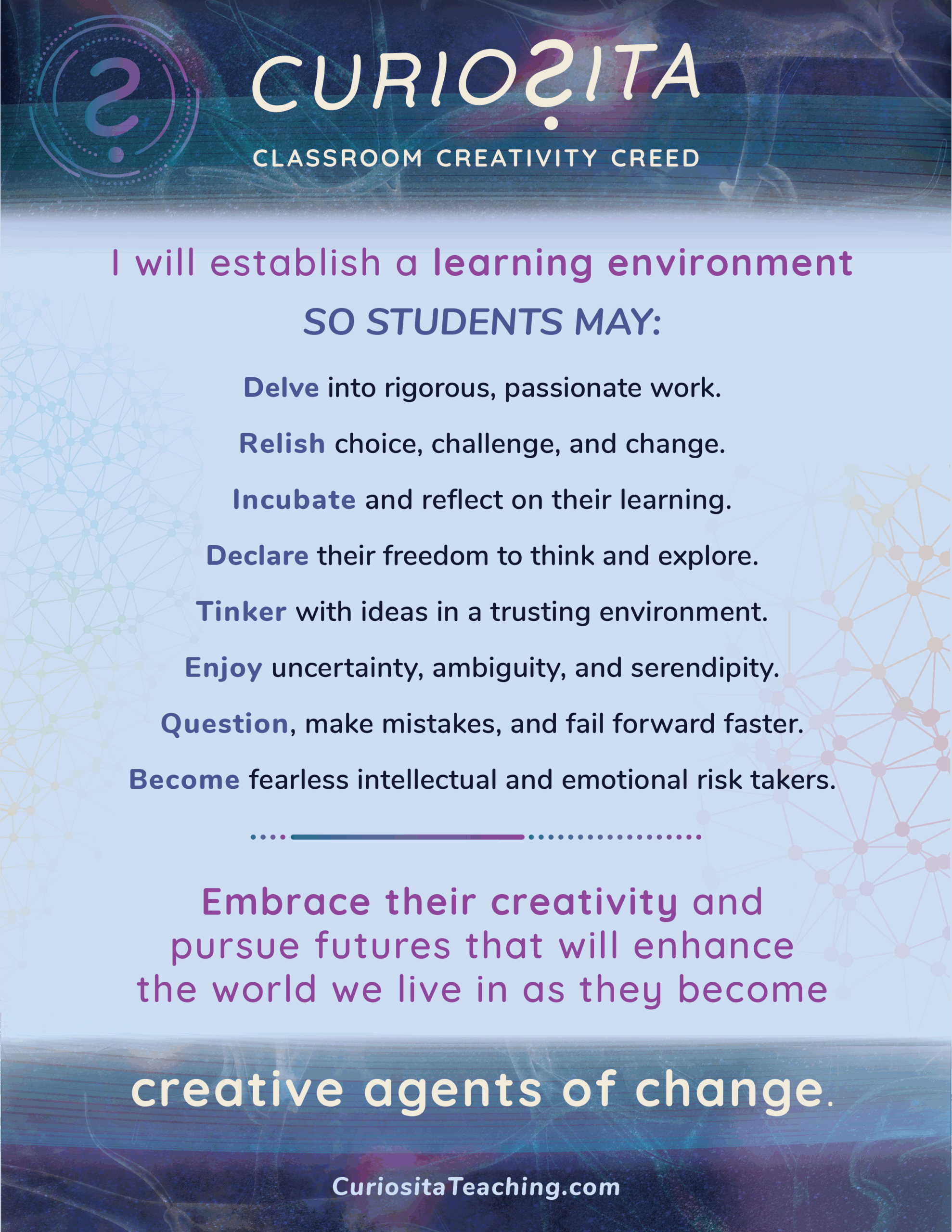 In an age ripe with uncertainty as well as opportunity, we at Curiosita empower future-minded educational leaders, teachers, and students to become creative agents of change — for life.